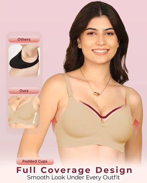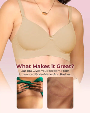 Meet your go-to bra for everyday confidence and comfort. Our Easy-Fit Padded Everyday Bra is crafted with stitch-free bonded technology for a smooth, invisible finish under fitted tops and tees. The lightly padded cups provide a natural lift and shaping while preventing show-through. Designed with an elastic-free bottom band and sidewings, it stays gentle on skin—no rashes, no red marks, no digging. Made from soft, breathable fabric, it feels like second skin while offering reliable all-day support. Perfect for work, casual outings, or lounging, this bra combines comfort, style, and invisibility in one everyday essential.