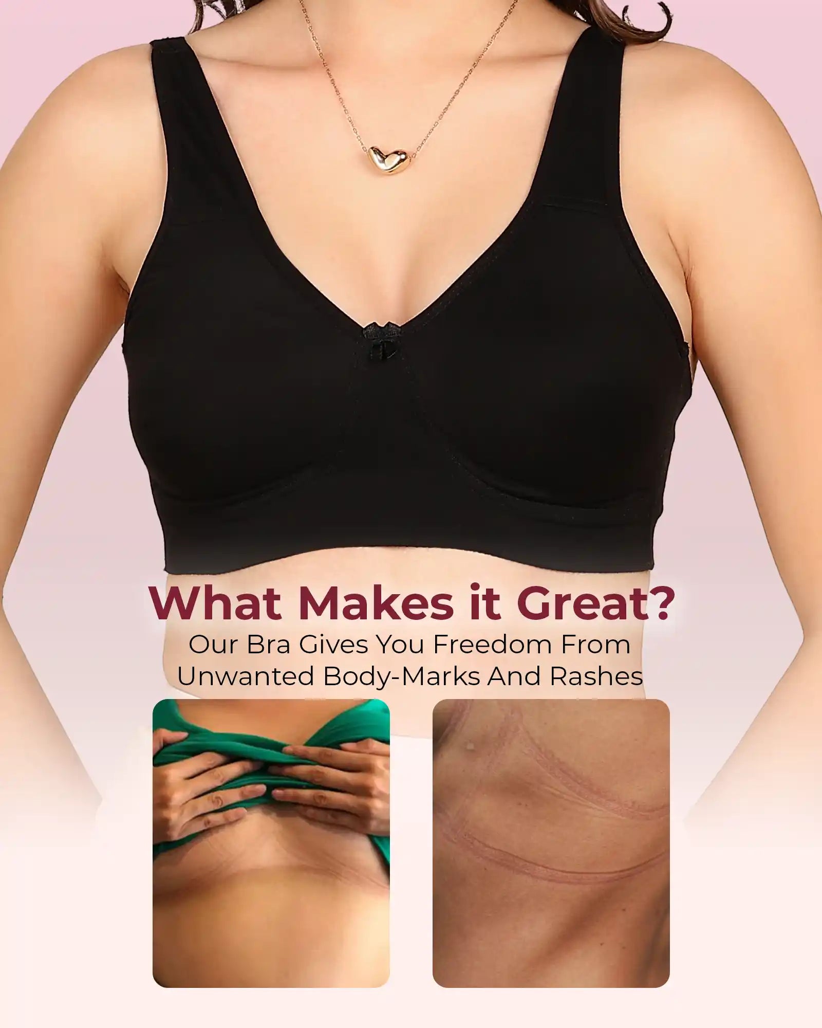 Elastic-Free Bottom Band: No elastic at the underband means no pinching, no body marks and no rashes – just a soft, gentle hold around your ribcage.