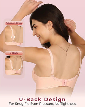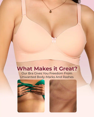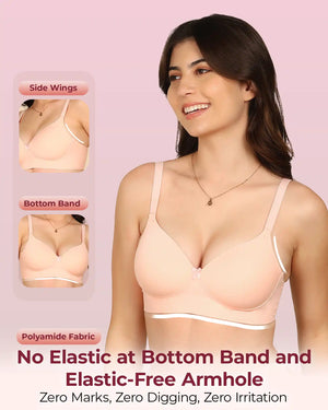 Meet your go-to bra for everyday confidence and comfort. Our Easy-Fit Padded Everyday Bra is crafted with stitch-free bonded technology for a smooth, invisible finish under fitted tops and tees. The lightly padded cups provide a natural lift and shaping while preventing show-through. Designed with an elastic-free bottom band and sidewings, it stays gentle on skin—no rashes, no red marks, no digging. Made from soft, breathable fabric, it feels like second skin while offering reliable all-day support. Perfect for work, casual outings, or lounging, this bra combines comfort, style, and invisibility in one everyday essential.